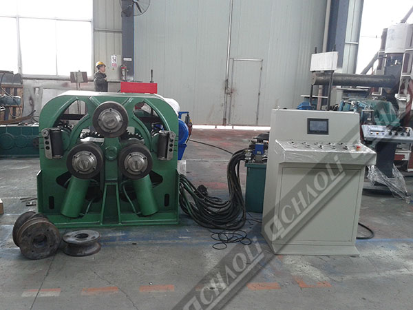 此設(shè)備為較為先進(jìn)型材彎曲設(shè)備,可做立式或臥式使用。更換模具可卷制各種型材及彎曲盤管。三輥均為主動輥,通過液壓馬達(dá)—齒輪傳動。設(shè)備有PLC 數(shù)控控制,帶矯正導(dǎo)向輥裝置,兩個(gè)側(cè)輥可圍繞固定回轉(zhuǎn)中心做弧線升降運(yùn)動。