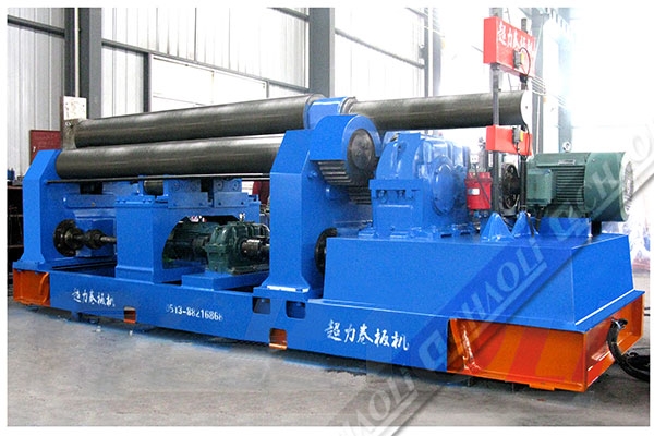 本機(jī)結(jié)構(gòu)型式為三輥對(duì)稱式,上輥在兩下輥中央對(duì)稱位置作垂直升降運(yùn)動(dòng),通過絲桿絲母蝸桿傳動(dòng)而獲得,兩下輥?zhàn)餍D(zhuǎn)運(yùn)動(dòng),通過 減速機(jī)的輸出齒輪與下輥齒嚙合,為卷制板材提供扭矩。本機(jī)床的缺陷是需借助其它設(shè)備實(shí)現(xiàn)預(yù)彎。本設(shè)備可卷板厚1mm-40mm,板寬8000mm的板料。